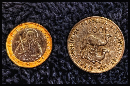 Photograph: A lovely Bulgarian one lev coin which I shall secure with my other precious keepsakes for the remainder of my days. I photographed it alongside a 100 francs piece from the French Territory of the Afars and the Issas to give an idea of scale.